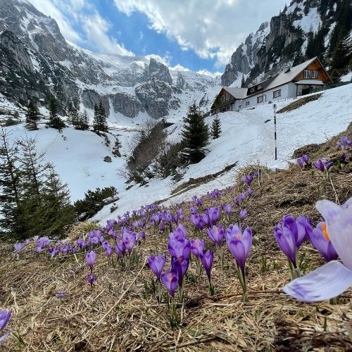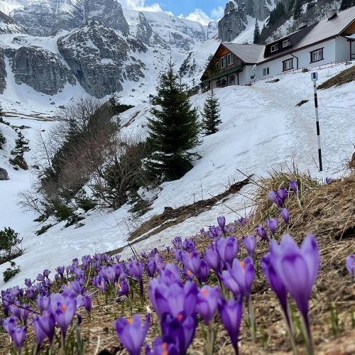 În această perioadă în care zăpezile se topesc, își fac simțită prezența în poienile de pe lângă cabană, minunatele brândușe